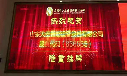 山東大宏智能設(shè)備股份有限公司成立于2005年4月,是一家專業(yè)從事制造、研發(fā)、設(shè)計自動化包裝設(shè)備和智能包裝物流解決方案為一體的綜合性國家高新技術(shù)企業(yè)、省“專精特新”企業(yè)。2016年3月18日新三板掛牌成功,股票簡稱:大宏智能, 股票代碼為:836635。